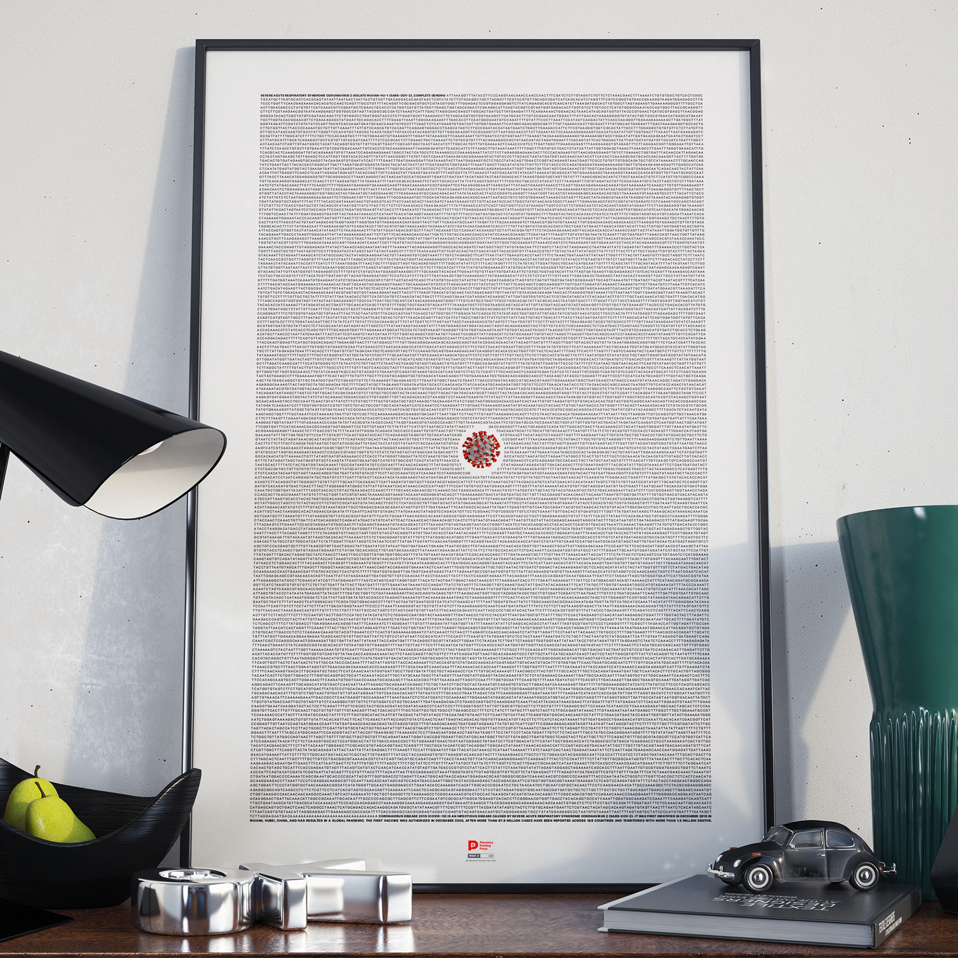 The first print displays the complete genome sequence of SARS-CoV-2, the virus that causes COVID-19. The second print displays the spike mRNA for Pfizer and Moderna vaccines.