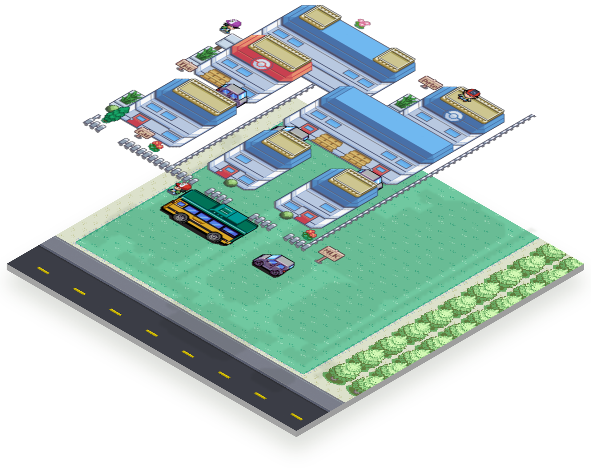 In this project, I reimagined my own neighborhood in Seattle as a Pokémon-style overworld map. Each building, street, and tree was illustrated pixel by pixel in Photoshop using a consistent grid and sprite scale.