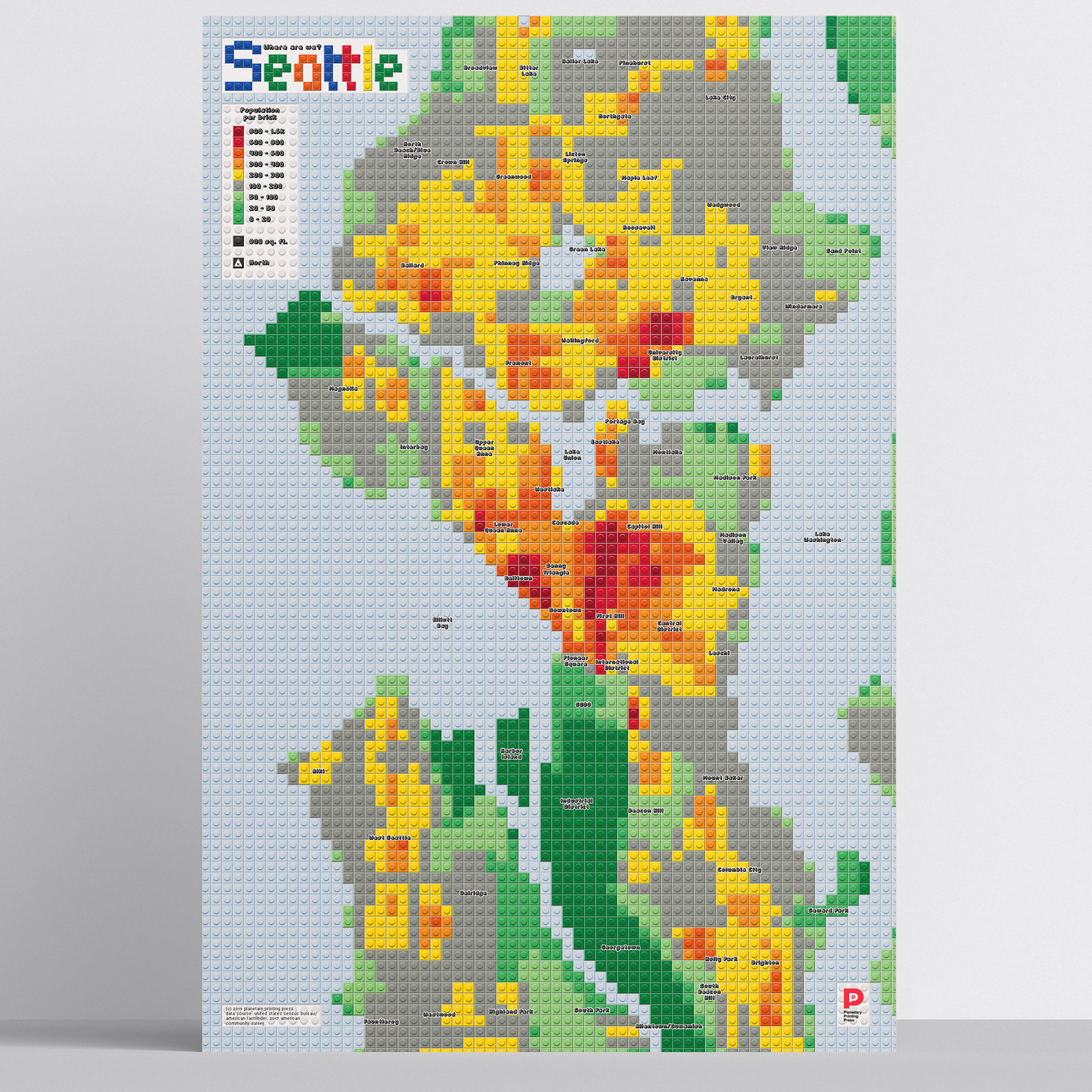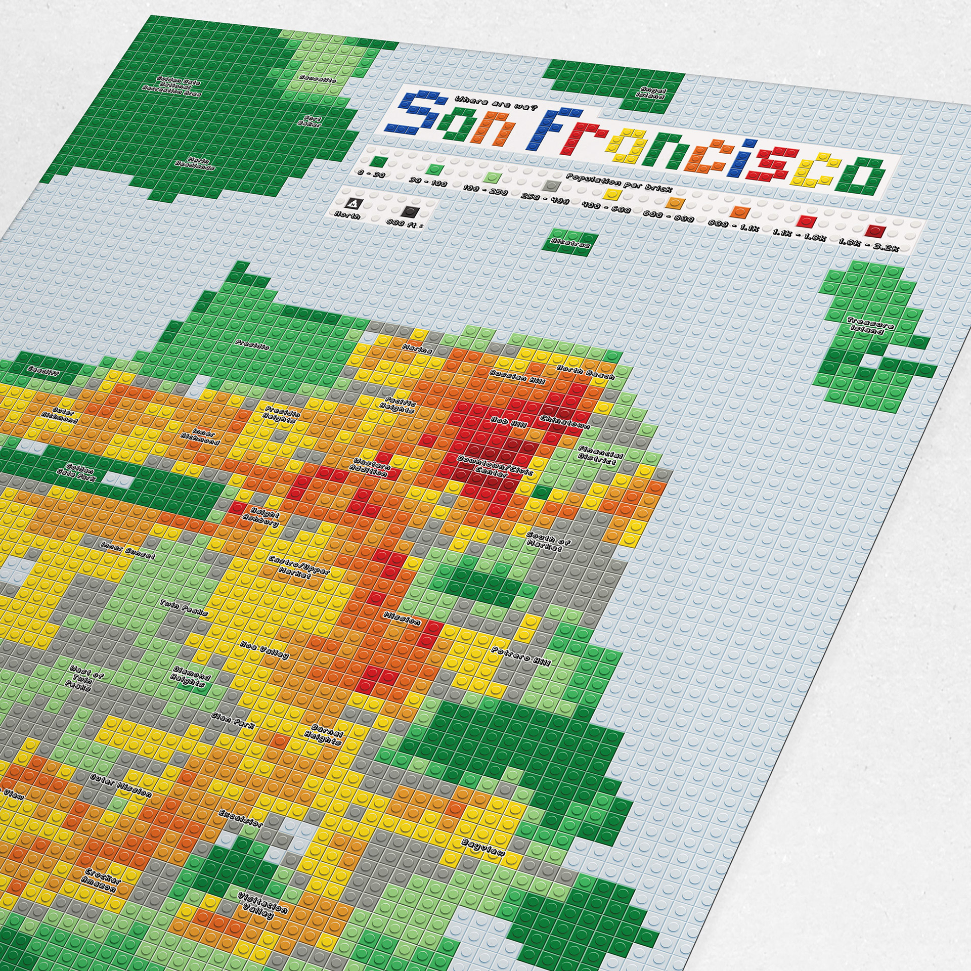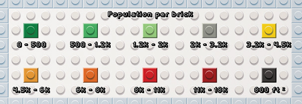In this map series, I show population density using different colors of Lego brick. What patterns do you see? This project was inspired by