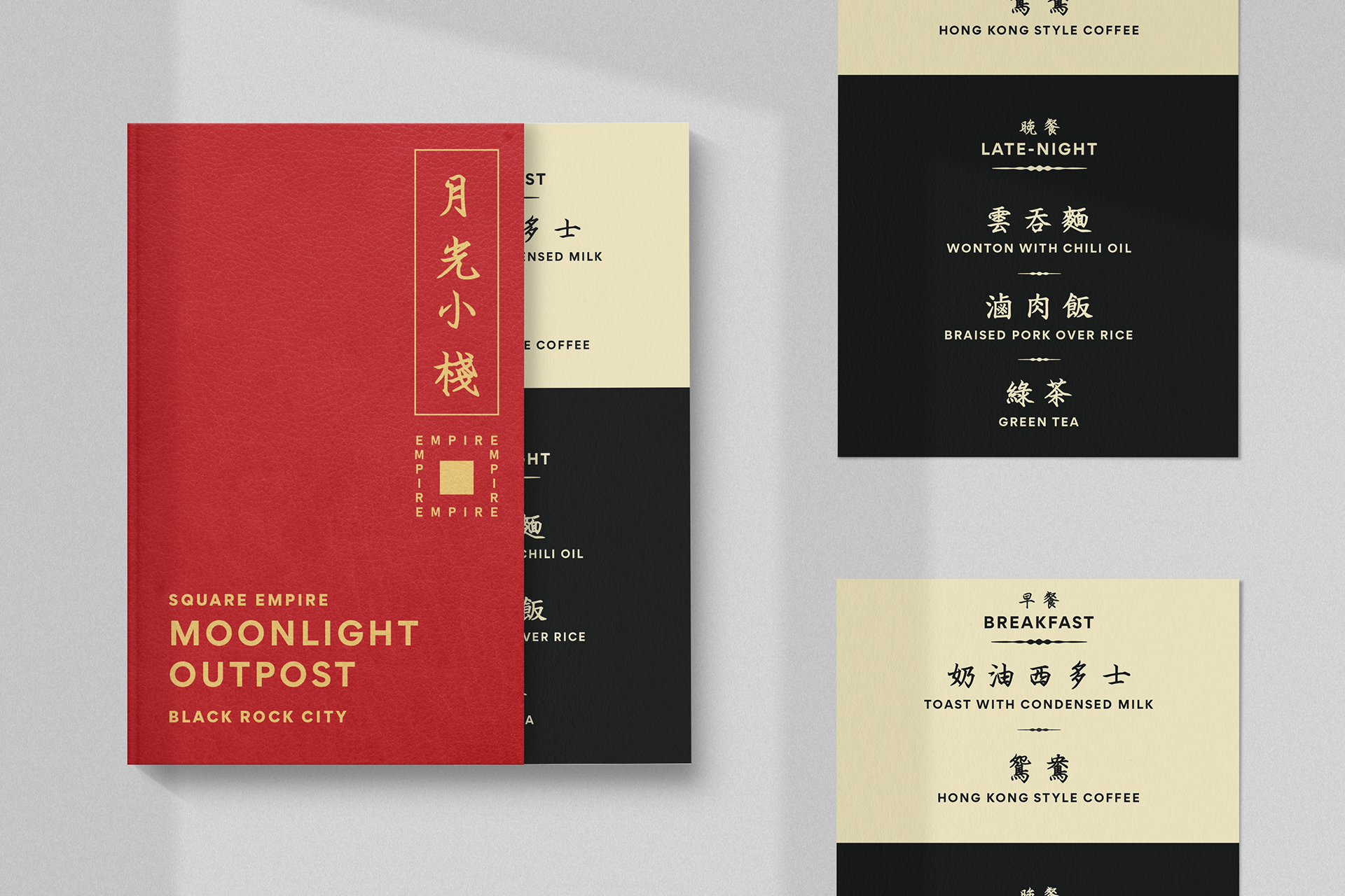 The below menu presents food served at Moonlight Outpost. The design draws upon cherished memories of my childhood spent dining in Hong Kong restaurants in Chinatowns across the US. These establishments, with their vibrant red and opulent gold foil accents, left an indelible mark throughout the 70s, 80s, and 90s. I sought to encapsulate this nostalgia through a contemporary lens. English text is presented in a minimalist font for a modern aesthetic. To evoke the sentimentality of Hong Kong's heritage, I opted for a traditional Chinese calligraphy typeface.