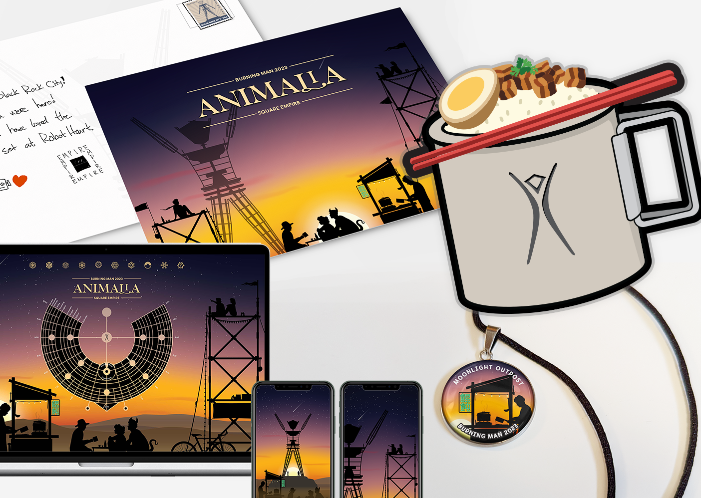 An extensive range of collateral was designed, including vinyl stickers, postcards, pendants, and digital wallpaper for both desktop and mobile. These elements further reinforced the design language and brand aesthetic.